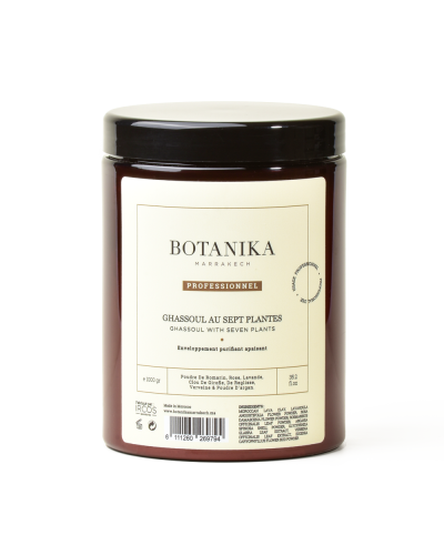 Le Ghassoul au Sept Plantes de Botanika Marrakech est une argile minérale naturelle, riche en bienfaits pour les soins capillaires et corporels. Utilisé depuis des siècles par les femmes marocaines, il nettoie en profondeur tout en éliminant les impuretés. Enrichi d’extraits de 7 plantes soigneusement sélectionnées, ce Ghassoul naturel purifie, apaise la peau et révèle son éclat naturel.